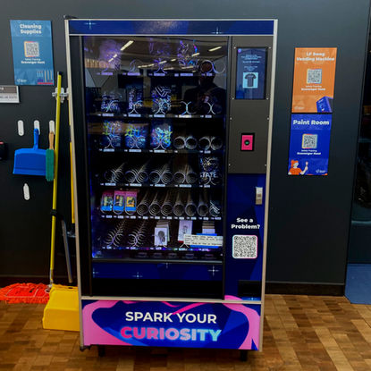 After the client chose the Spark Your Curiosity design, there were a few edits. The main being that the light bulb rocket needed to be on both sides of the machine. Though it looked cohesive in a flat lay, if you were only looking at one end of the machine, it wouldn't make sense. The second being one added myself. I noticed that there was a taped paper with a QR code to report errors in the machine. To fill up empty space in the design and make the machine look the best it possibly can, I added another panel with a QR code to report malfunctions that read "Got a Problem?" and ended up with this final design.